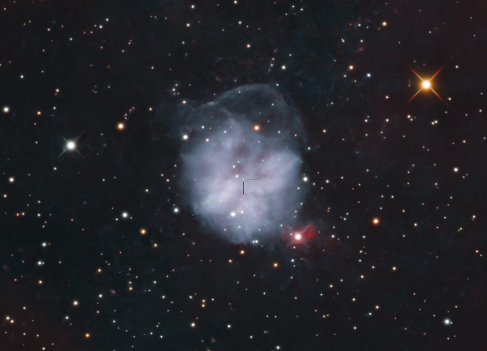 Die Aufnahme entstand am 5.Jan 2026 am 14″-RC, wobei Schmalbandaufnahmen mit HII- und OIII-Filtern 18 / 20x600s verwendet. SII- und NII-Emissionen waren auf Testaufnahmen nicht feststellbar. Zusätzlich wurden je 10x60s R,G,B-Aufnahmen für dir richtigen Sternfarben verarbeitet.