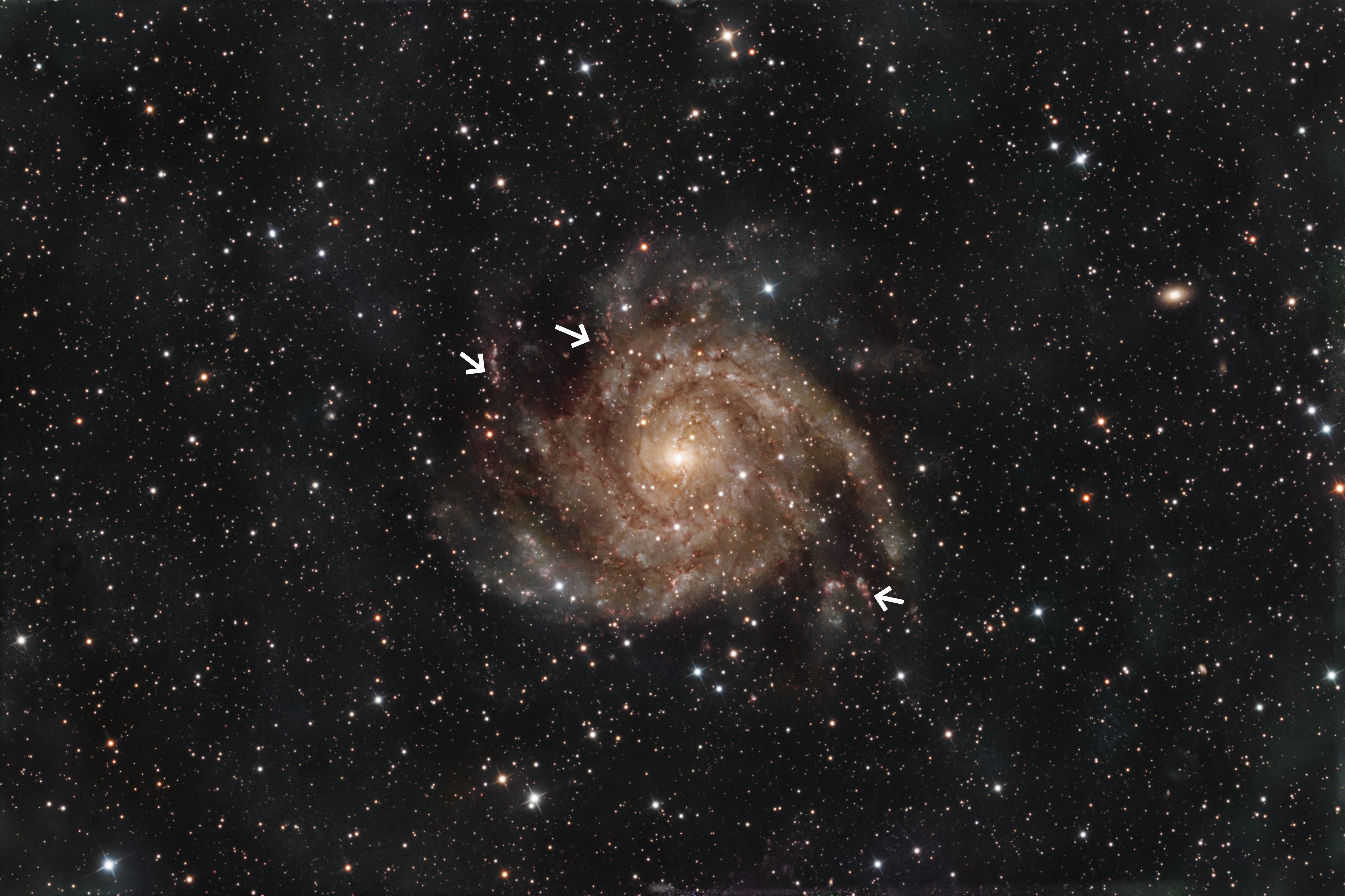 Auf meiner Aufnahme mit dem 14“-RC erkennt man IC 342 als große Spirale in der Draufsicht („face-on“) mit ausgeprägter Kernregion und vielgestaltigen Spiralarmen. Diese laufen nicht ungestört symmetrisch um den Kern, sondern zeigen an einigen Stellen Verzweigungen und starke Richtungswechsel. Im Südwesten läuft ein extrem lichtschwacher Spiralarm nach außen und weit vom Galaxienkörper weg. In den Randzonen fallen ringsum viele rötlich erscheinende HII-Regionen (Pfeile) um junge Sternentstehungsgebiete auf. IC 342 wird den Starburst-Galaxien zugerechnet, weil sie viele Zonen aktiver Sternentstehung zeigt. Das sind in der Regel blaue Sternansammlungen. Sie sind aber durchweg von gelblichem Licht überlagert.