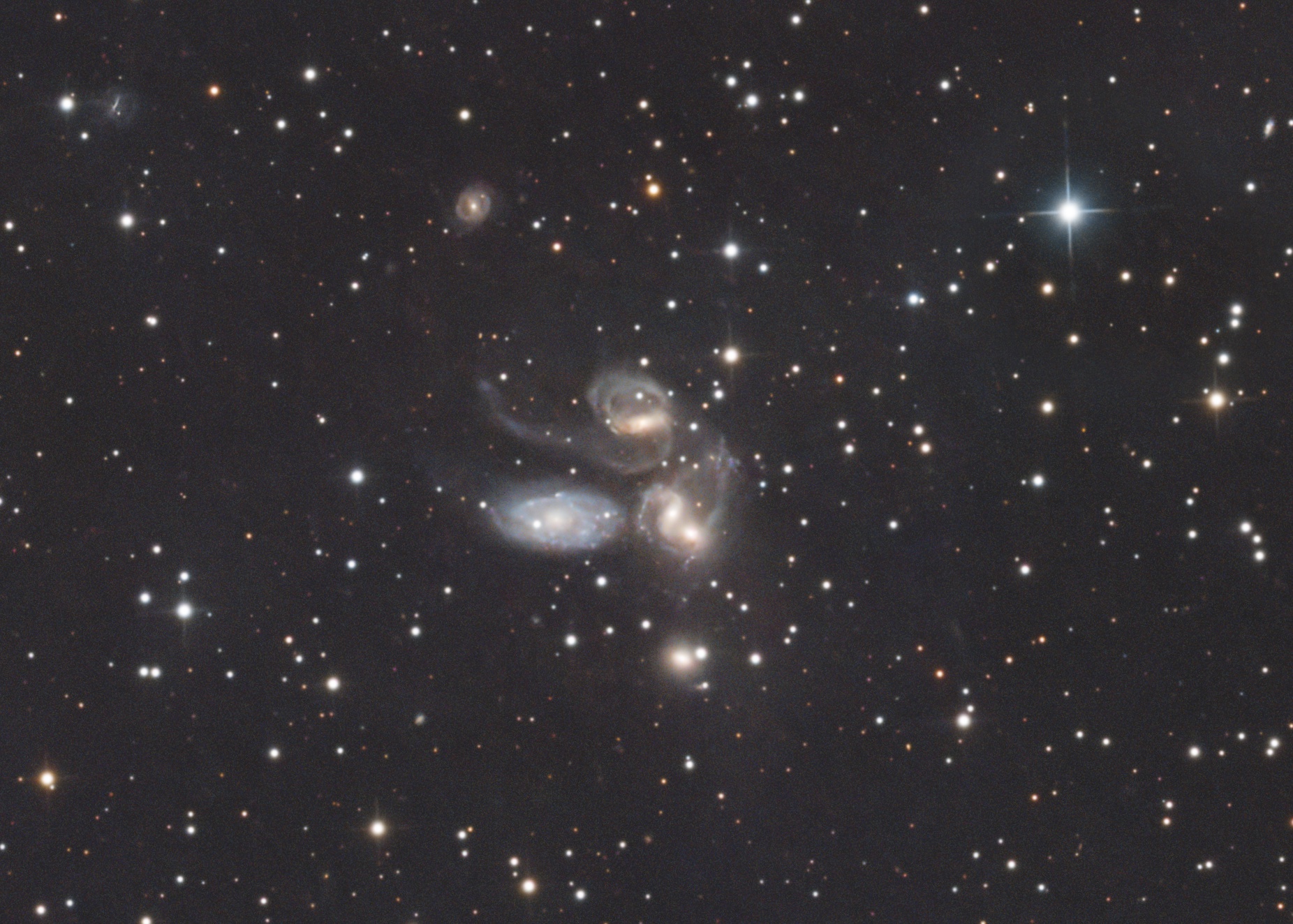 Das Stephans Quintett besteht aus fünf Galaxien, die sich in einem engen Raum von 5 Bogenminuten befinden. Die Galaxien sind: