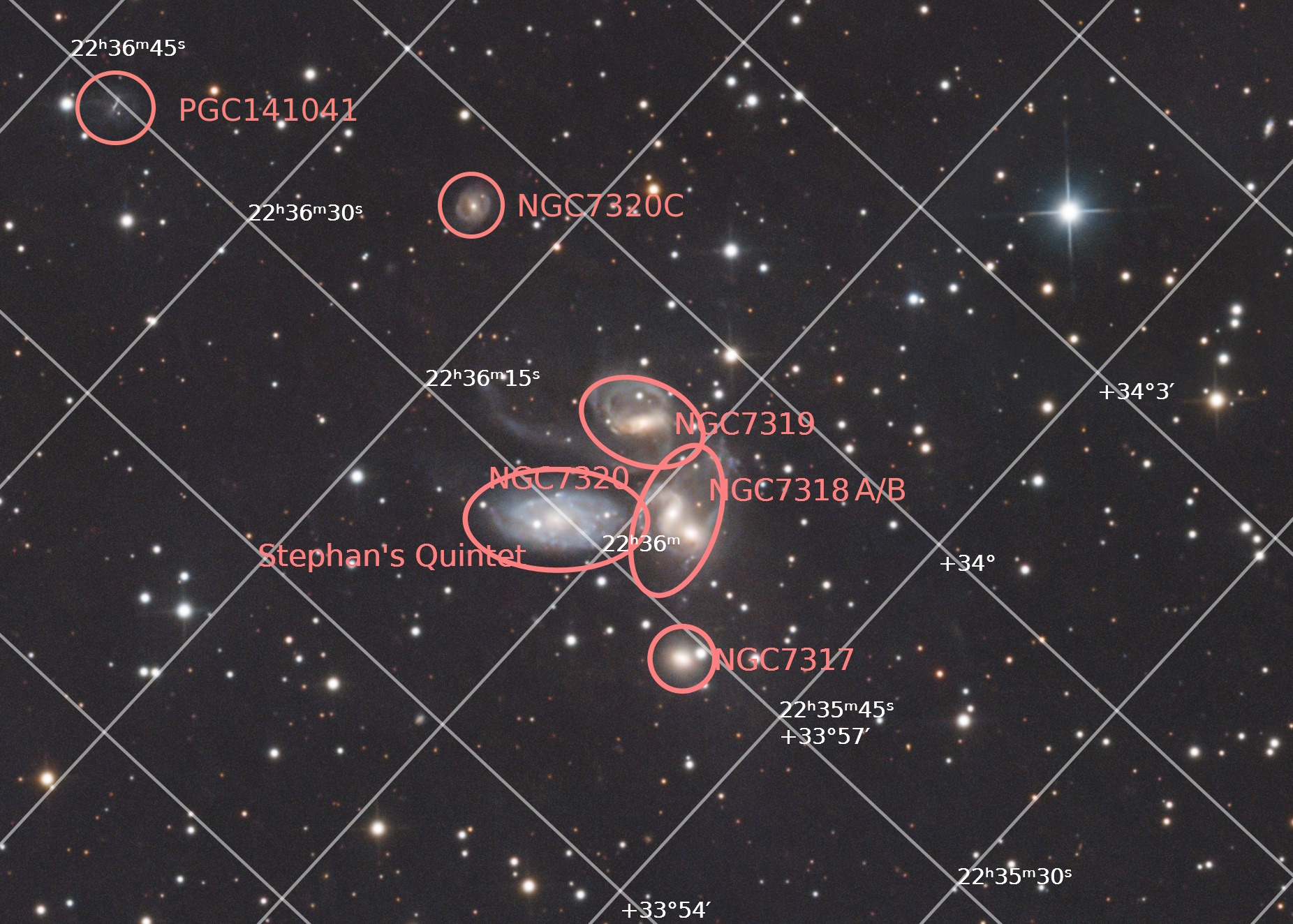 - NGC 7320C: Eine linsenförmige Galaxie, die sich weiter oben etwas abseits der anderen vier Galaxien befindet, aber dennoch Teil des Quintetts ist.