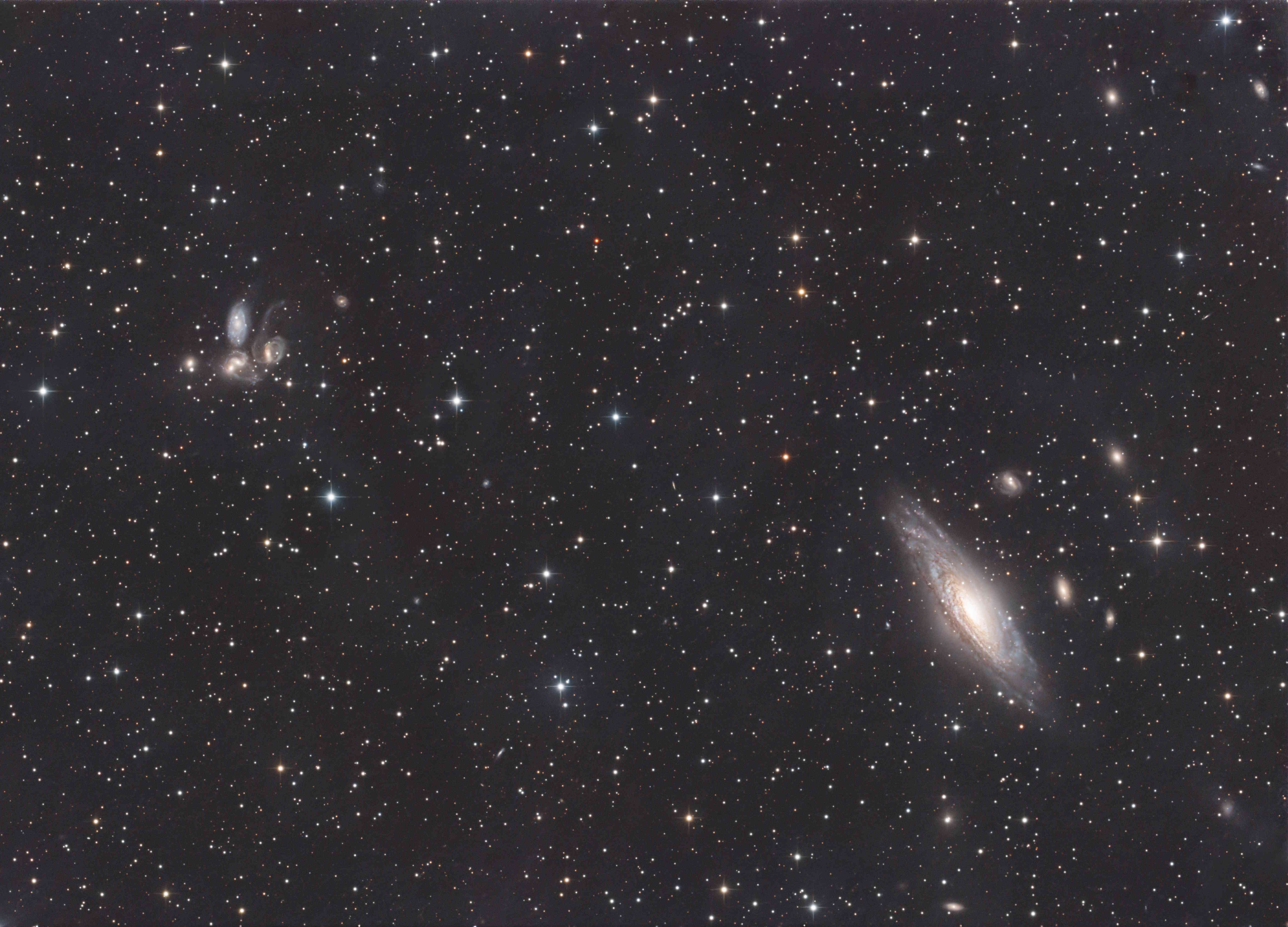 Das Stephans Quintett ist eine Galaxiengruppe, die sich im Sternbild Pegasus befindet. Sie ist eine der bekanntesten und am besten untersuchten Galaxiengruppen. Für die Aufnahme mit dem 14“-RC-Teleskop bei 2.280 mm Brennweite wurden 230 Einzelaufnahmen der Touptek Kamera SkyEye24AC mit je 120s Belichtungszeit verarbeitet. Dies ergibt eine Gesamtbelichtungszeit von 7,7 Stunden. Die Aufnahme ist ein Ausschnitt von 16,5 x 11,9 Bogenminuten (zum Vergleich: der Mond erscheint unter einen Blickwinkel von etwa 30 Bogenminuten). Die unbeschnittene Aufnahme zeigt links dominant die Galaxie NGC 7331, eine Vordergrund-Galaxie in etwa 46 Mio Lichtjahren Entfernung.