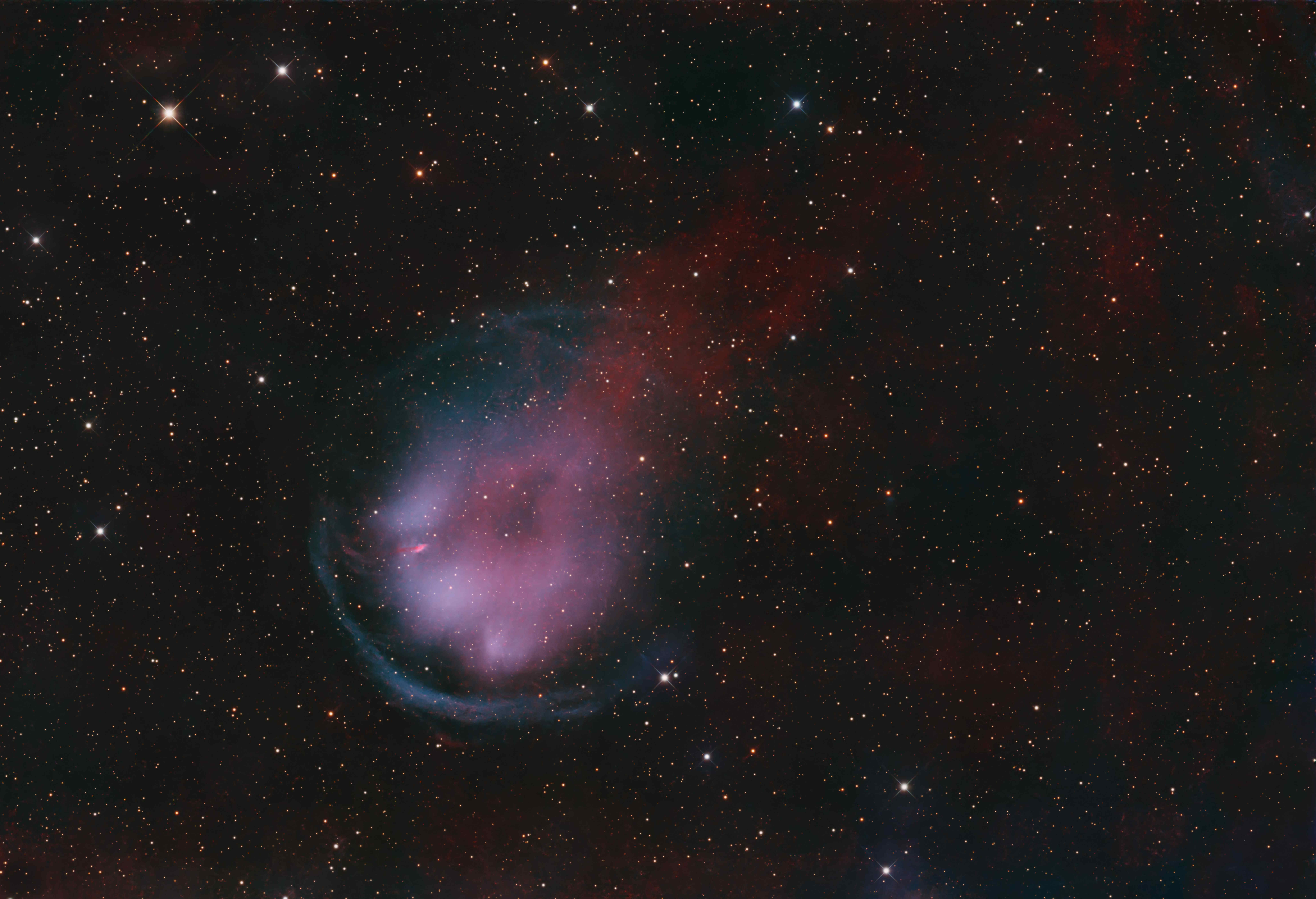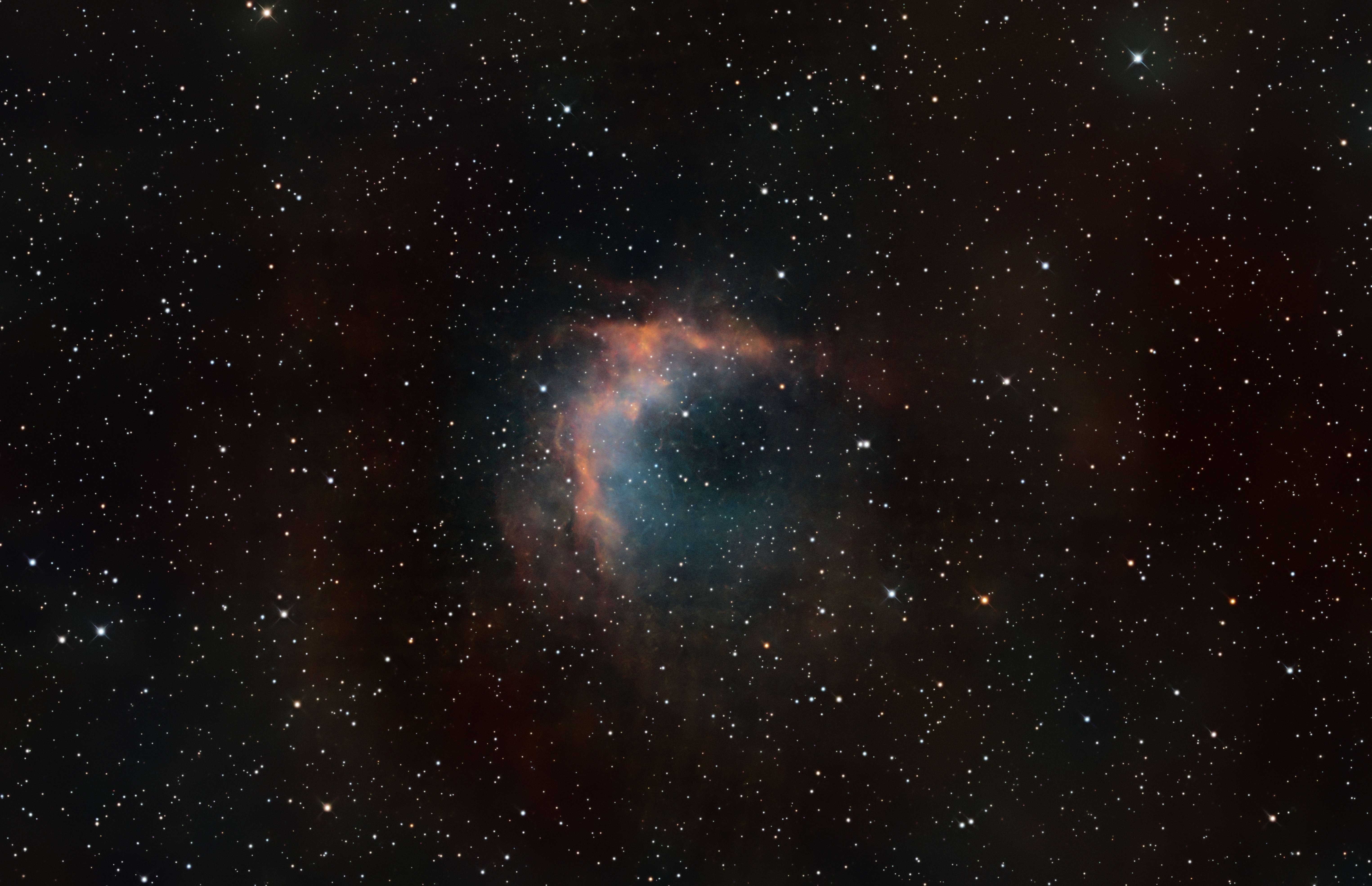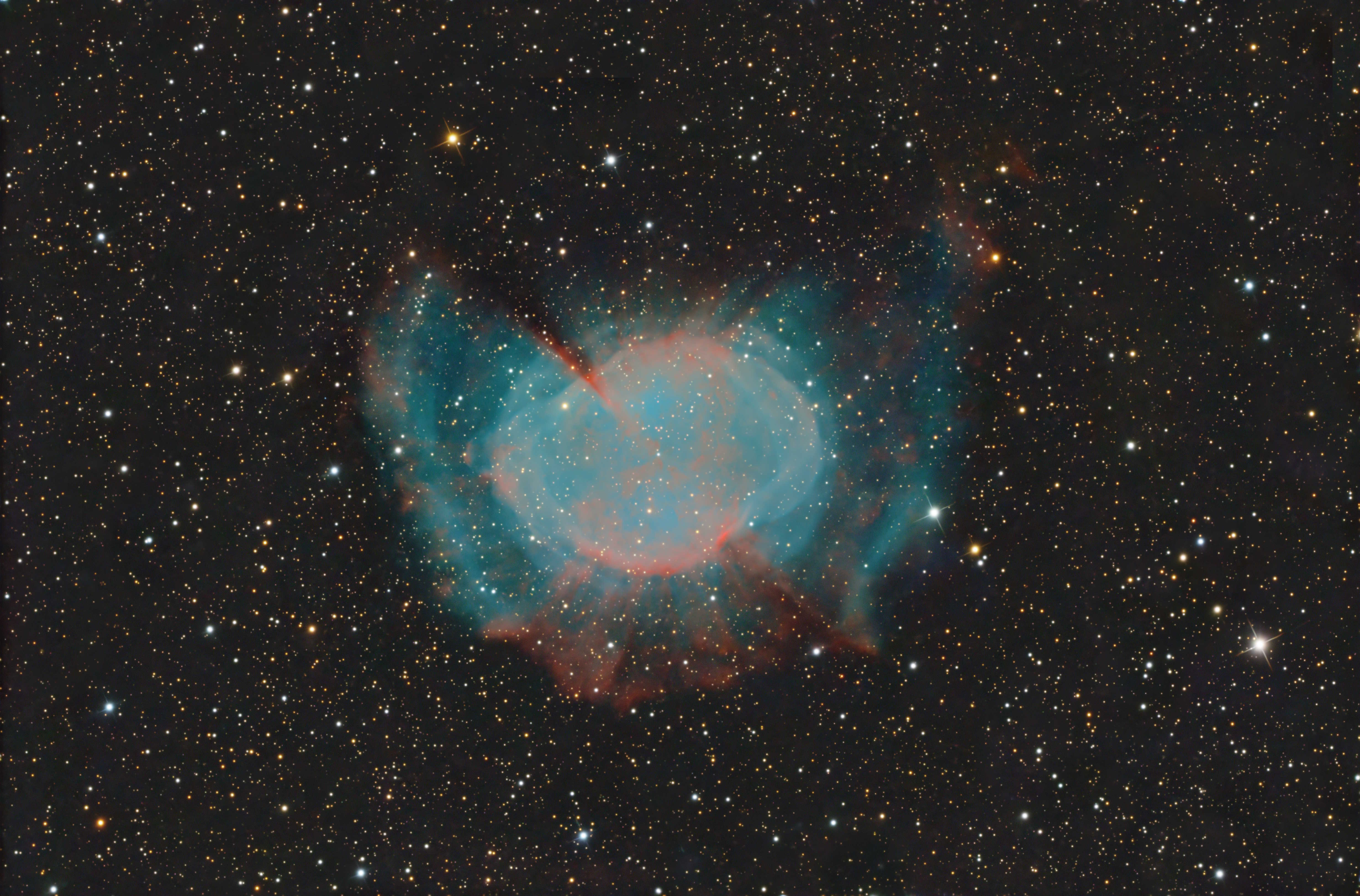 Das Foto zeigt M 27, den bekannten Hantelnebel. Auf der langbelichteten Aufnahme sieht man mehrere expandierende Gasschalen, die aus unterschiedlichen Ausbrüchen des Zentralsterns stammen.