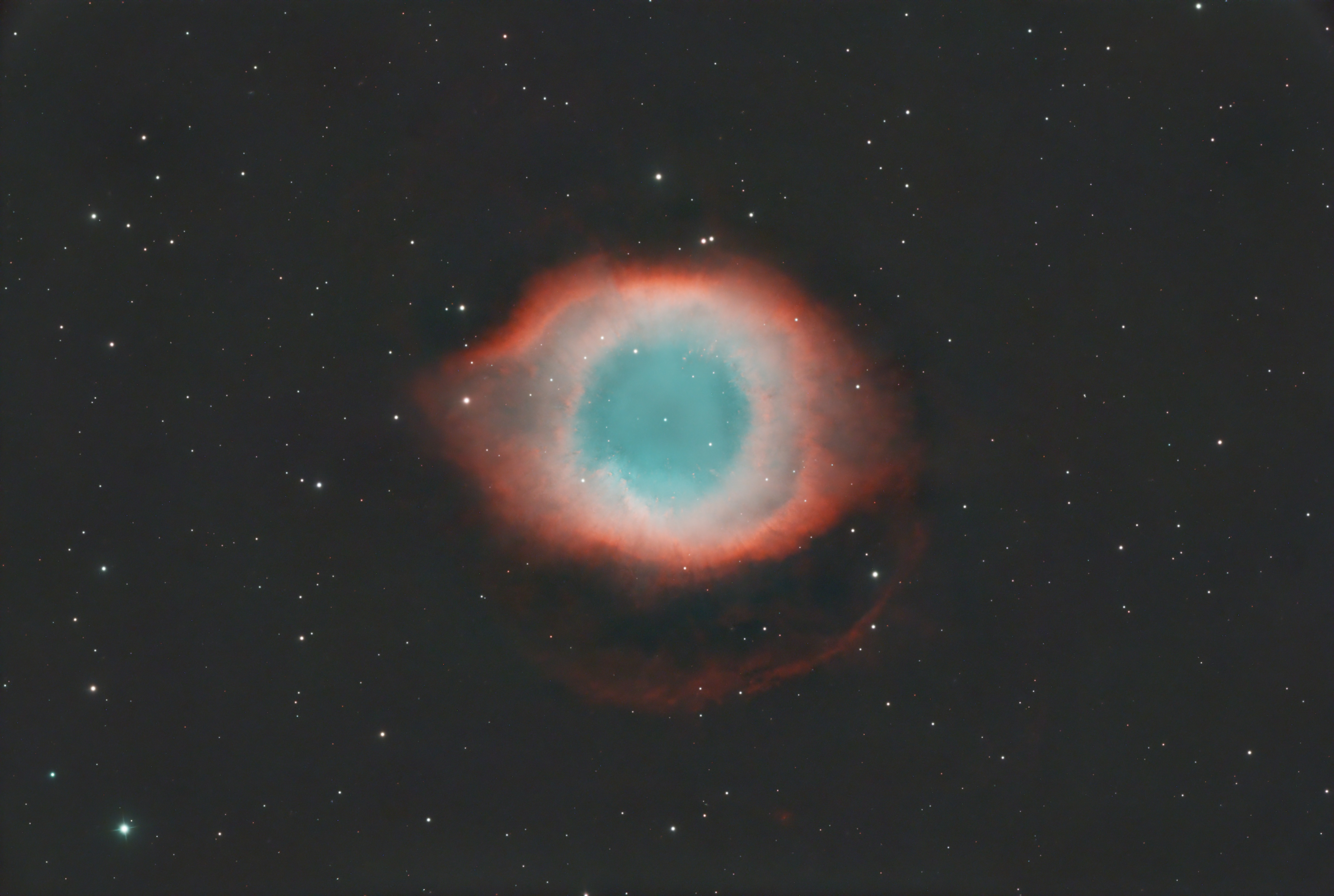 Das Foto zeigt M 27, den bekannten Hantelnebel. Auf der langbelichteten Aufnahme sieht man mehrere expandierende Gasschalen, die aus unterschiedlichen Ausbrüchen des Zentralsterns stammen.