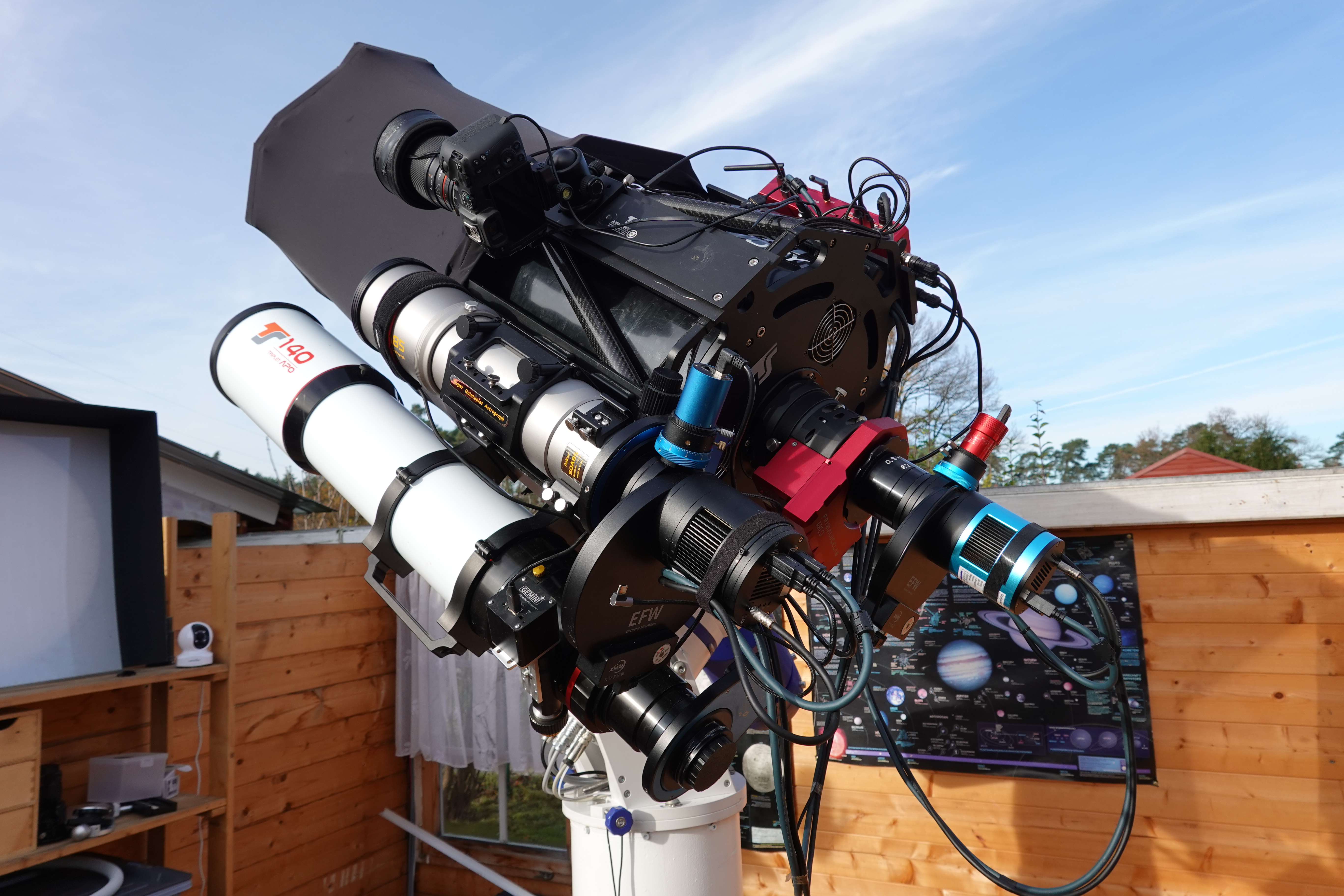 Um der Vielfalt des Universums was die Größe der Objekte angeht gerecht zu werden, sind mehrere Teleskope mit unterschiedlichen Brennweiten parallel montiert. Die Spannweite liegt zwischen 50 mm und 5.690 mm (mit 2xBarlow für Planetenfotografie).