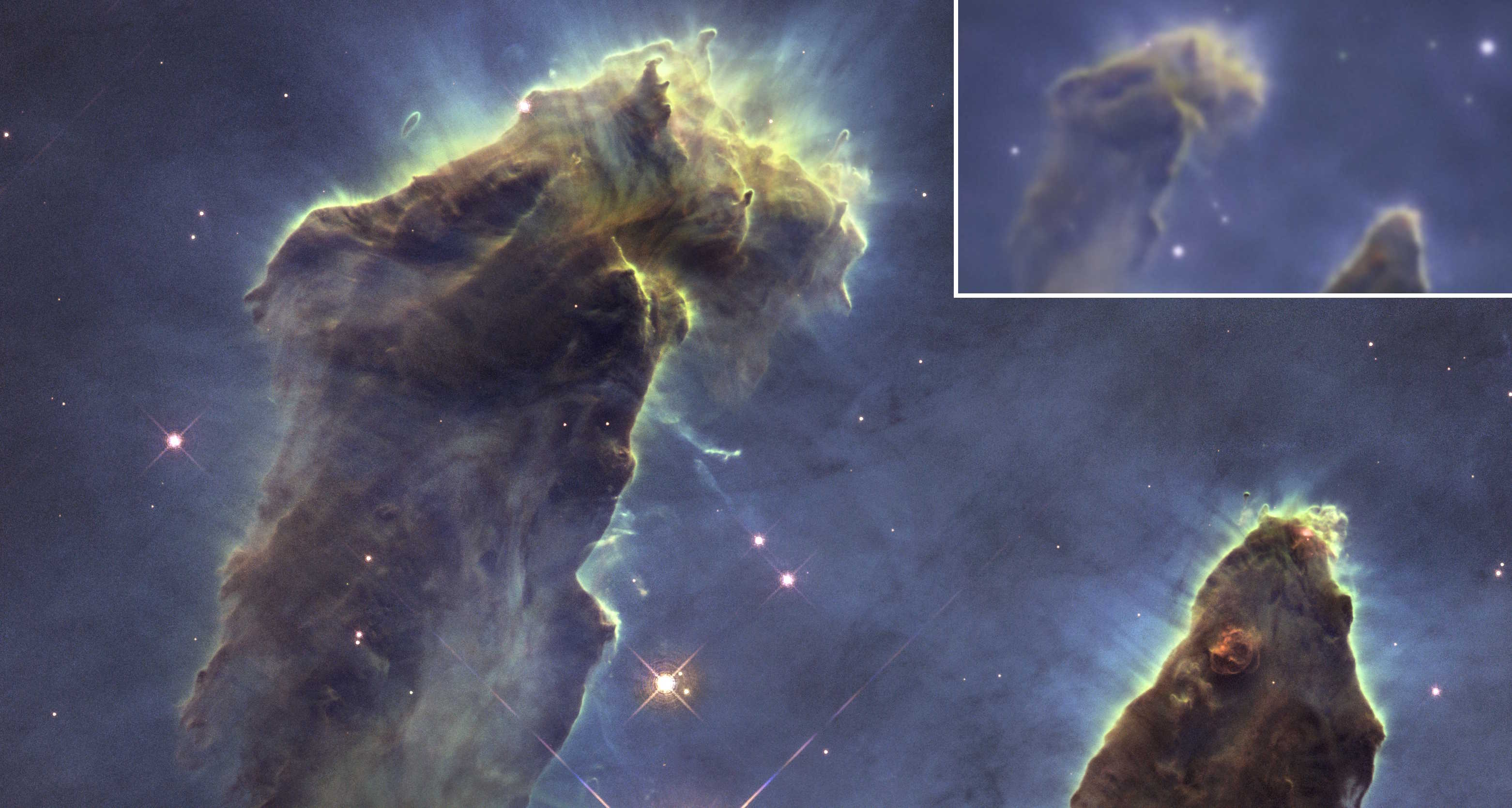 Astronomers combined several Hubble exposures to assemble the wider view. The towering pillars are about 5 light-years tall. The dark, finger-like feature at bottom right may be a smaller version of the giant pillars. The new image was taken with Hubble’s versatile and sharp-eyed Wide Field Camera 3.